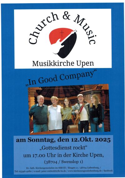 Am diesem Sonntag rockt wieder die "Church & Music" im Gottesdienst mt der Band "In Good Company"! Herzliche Einladung sich von christlicher Botschaft und Rockmusik wieder begeistern zu lassen!